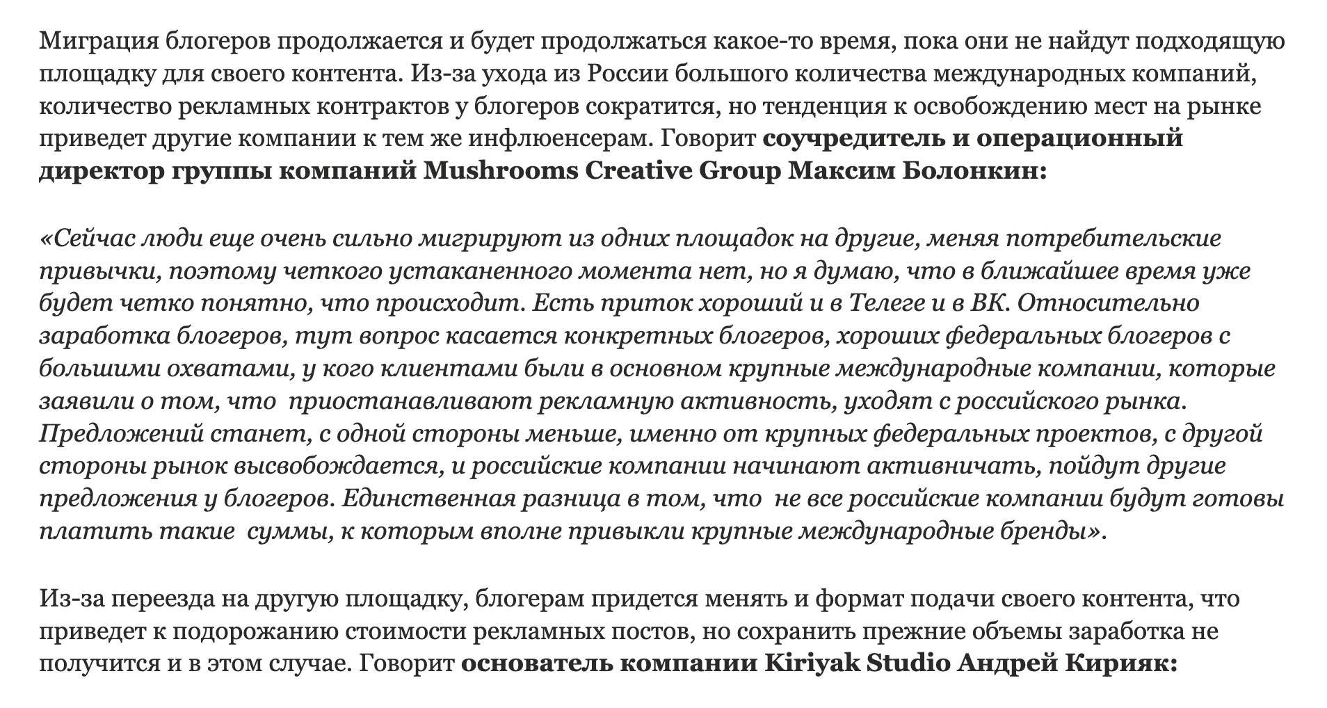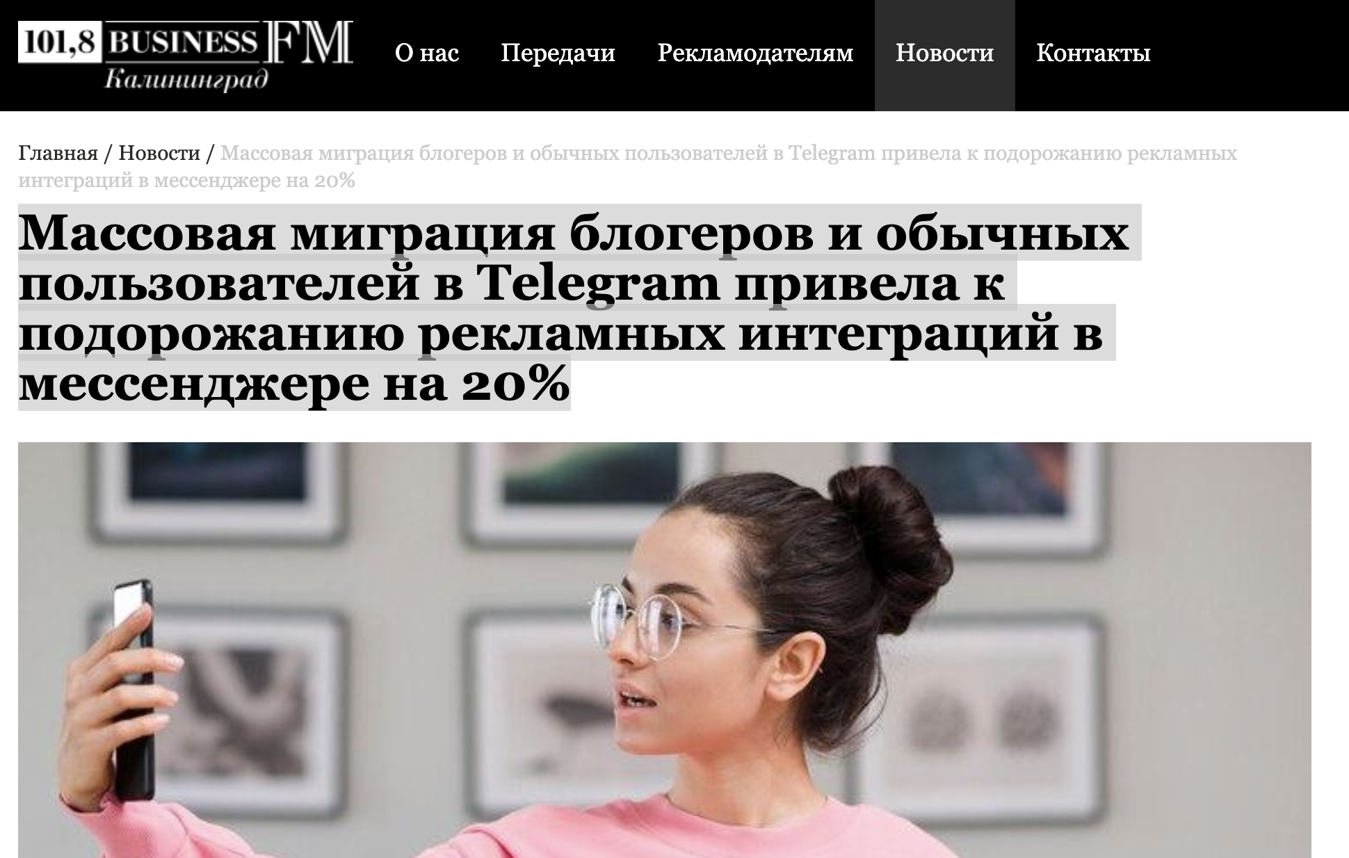 07.04.2022 Бизнес ФМ — Массовая миграция блогеров и обычных пользователей в Telegram привела к подорожанию рекламных интеграций в мессенджере на 20%