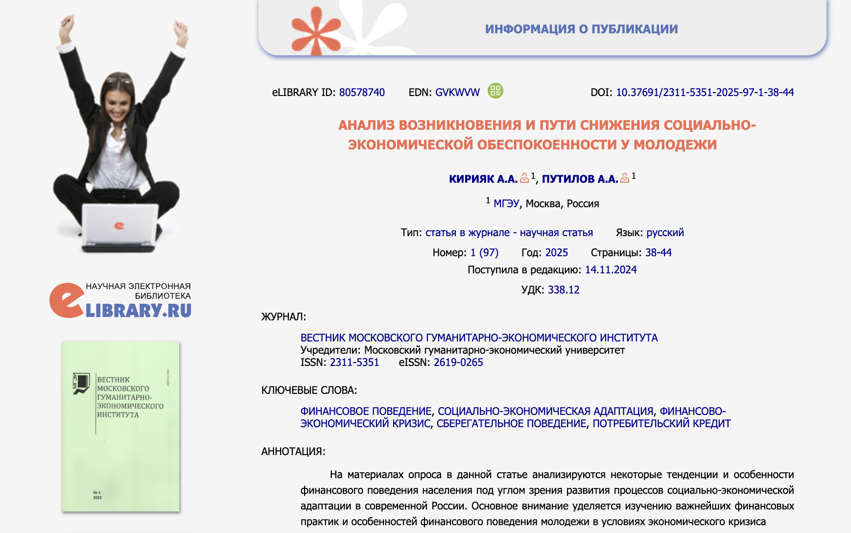 АНАЛИЗ ВОЗНИКНОВЕНИЯ И ПУТИ СНИЖЕНИЯ СОЦИАЛЬНО-ЭКОНОМИЧЕСКОЙ ОБЕСПОКОЕННОСТИ У МОЛОДЕЖИ КИРИЯК А.А.1, ПУТИЛОВ А.А.1 1 МГЭУ, Москва, Россия Тип: статья в журнале — научная статья Язык: русский Номер: 1 (97) Год: 2025 Страницы: 38-44 Поступила в редакцию: 14.11.2024 УДК: 338.12 ЖУРНАЛ: ВЕСТНИК МОСКОВСКОГО ГУМАНИТАРНО-ЭКОНОМИЧЕСКОГО ИНСТИТУТА Учредители: Московский гуманитарно-экономический университет ISSN: 2311-5351eISSN: 2619-0265 eLIBRARY ID: 80578740 EDN: GVKWVW DOI: 10.37691/2311-5351-2025-97-1-38-44